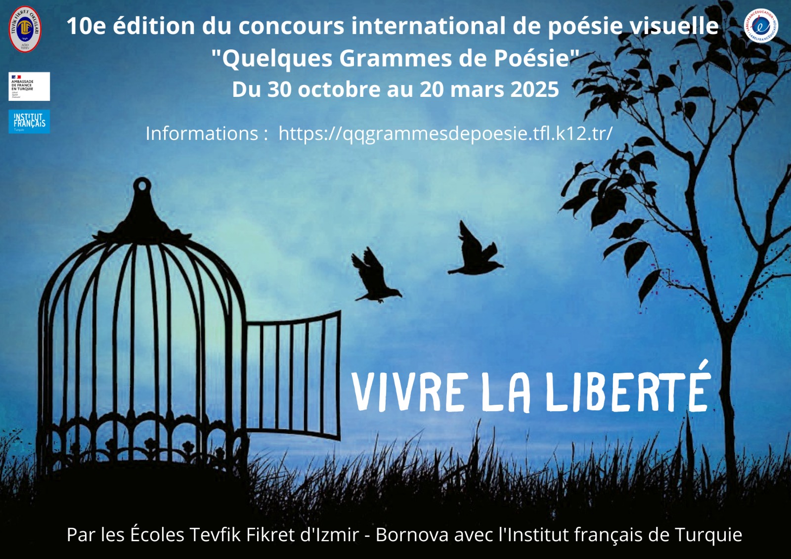Les candidat.e.s doivent envoyer leur production avant le 20 mars 2025 minuit à qqgrammesdepoesie@tfl.k12.tr en précisant prénom, nom, âge, adresse, établissement, ville.